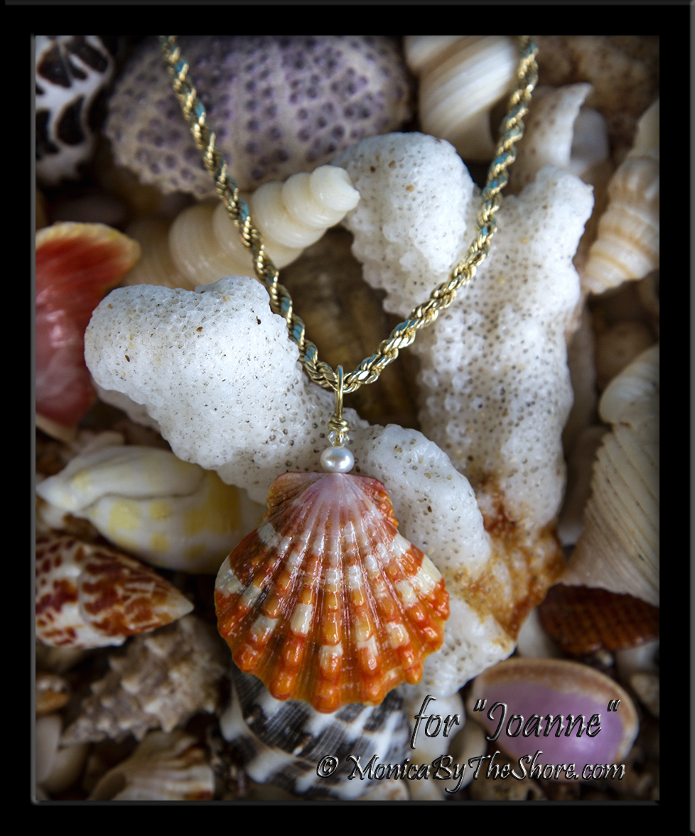 Custom for "Joanne", a beautiful deep orange with white Sunrise Shell pendant, with Pearl and Swarovski Crystal, on gold. Mahalo for the honor of creating these jewelry designs for you Joanne, wear with Aloha and a smile!