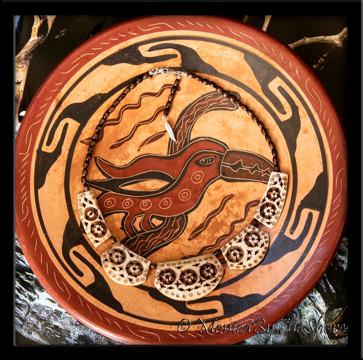 The "Huntress" necklace is beautifully carved bone and polished wooden beads jewelry. The total length of the necklace is 17 inches and has a 2" decorative wooden bead and a sterling silver feather charm draping from the back. All finding are sterling silver. True authentic, local style adornment, one of a kind hand crafted in Hawaii! Wear this special necklace with Aloha!