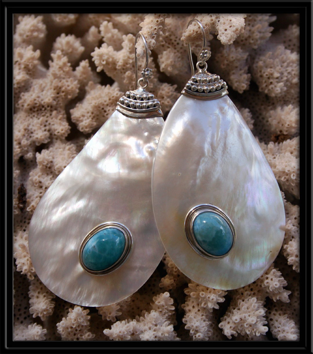 Elegant Larimar and Mother of Pearl drop earrings. These earrings definitely "make a statement"! Three inches of pure Mermaid glamor, the Mother of Pearl is the highest quality available and full of luster, and the beautiful blue Larimar oval stones are delicious! Designed by my friend Taso of Honolulu, crafted in Indonesia.