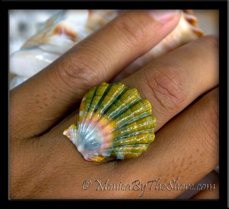 Such a unique Hawaiian Sunrise Shell! Like a "Moonbow", this shells colors display the spectrum of rainbow colors ~ yellow, pink, orange, green, blue, purple ~ all within the special "Moonrise" dark green crown that extrends to ruffle edges of the scallop shell! This gorgeous seashell is mounted on a decorative Balinese sterling silver ring band, size 6 - 6 1/2. This flawless shell, with its amazing rainbow pattern and perfect shape and detail is one very full and round inch in size. For fans of the more unique rainbow or Moonrise colors, this one sure to please, its a treasure of a shell, and worn as a ring your eyes will delight in its beauty very often!
