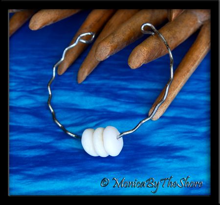 A trio of three North Shore Puka Shells from Ke Iki Beach dangle from a wave pattern bangle bracelet! These Puka Shells are shiny pure white and they surf along the wavy open ended bangle bracelet. Waves and Puka Shells, nothing says "North Shore" more than this!
