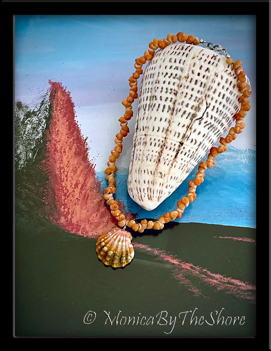 Orange Mongo Shells necklace with multi color Hawaiian Sunrise Shell in blends of pink, orange, green and yellow colors. The necklace is 15 inches and the Sunrise Shell is 1 1/8th inches, a beautiful top shell, perfect in every detail! If you watched Jason Manoa's Chief of War movie, this necklace is made of the same shells as Ka'ahumanu shell necklace, Ka'iana's (Jason's) true love and the secret rightful heir of Maui.