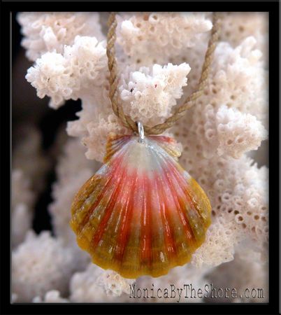 Beautiful bright Peach & Gold Sunrise Shell pendant on a natural color twisted cord necklace. This shell is 7/8 inch, the same size as a U.S. nickel coin. Cord necklace is 20 inches long.