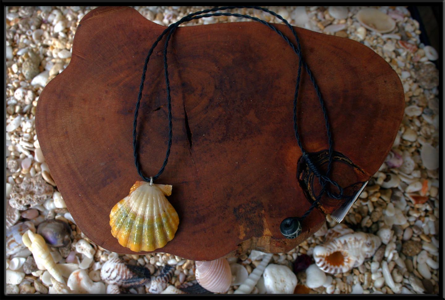 This nicely shaped North Shore Sunrise Shell has a great amount of pure white color, then blends to greens and yellows. This shell has perfectly shaped 'squared' wings and really nice deep ridges. There are two tiny specs (indentations) that are actually more visible in the picture than on the shell itself, but it is worth noting in this description so please view the close up picture. Unusual coloration with such an even, white pattern at the top! Necklace is black cord.